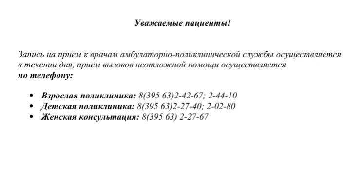 - Call-центр по дистанционной записи: 8(39563)2-42-67; 8(39563)2-27-40