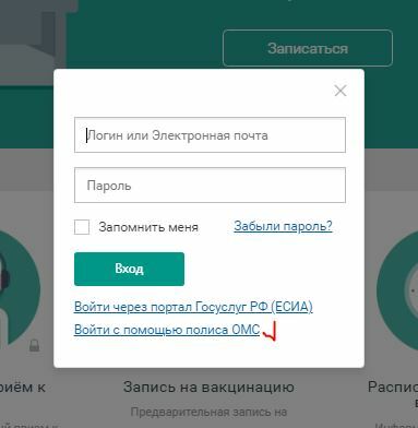 Для того, что бы авторизоваться с помощью полиса ОМС, нажмите на соответствующую ссылку, далее система вас попросит ввести полис ОМС и дату рождения.